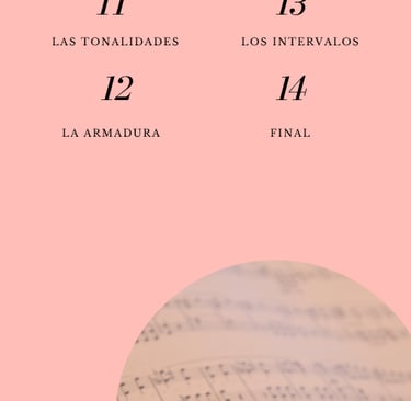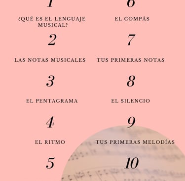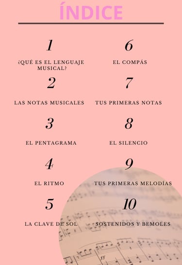 A lo largo de los capítulos, aprenderás a reconocer las notas, comprender el pentagrama, entender ritmos, compases, silencios, tonalidades, intervalos... y todo esto para llegar a ponerlo a la práctica y tú mismo/a ser capaz de aplicarlo a cualquier canción.